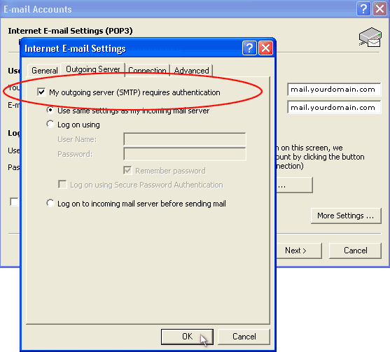 Setting up SMTP Authentication for Microsoft Outlook 2002If your ISP does not provide SMTP server service for your use, you may use the Dollarhost mail server for SMTP. You will have to specify your Outlook 2002 software to authenticate in order for the SMTP server to accept your outgoing email. On your Outlook 2002 Internet E-mail Settings (POP3) page, enter mail.yourdomain.com as your Outgoing mail server (SMTP) and then click More Settings....