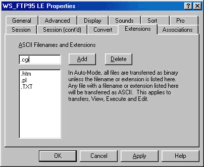 - You must configure the ASCII extensions so that your text based files will transfer correctly. Get to this window by clicking Options at the bottom of the main window and selecting the Extensions tab. Here you enter .htm, .html, .pl, .txt, .cgi or any other file extensions that need to be transferred as text.