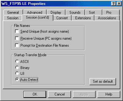 - Click on the Session (cont'd) tab and select Auto Detect under the Startup Transfer Mode.